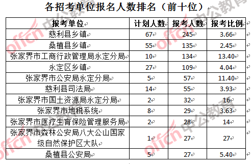 競(jìng)爭(zhēng)熱門招考單位,前三位依次是:張家界市森林公安局八大公山自然保護(hù)區(qū)大隊(duì)(競(jìng)爭(zhēng)比例27:1)、張家界市國(guó)土資源局永定分局(競(jìng)爭(zhēng)比例16:1)和張家界市醫(yī)療生育保險(xiǎn)管理服務(wù)局(競(jìng)爭(zhēng)比例14:1)。