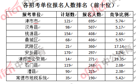 為幫助廣大考生更清晰的了解報名情況,中公教育整理了常德市各招考單位的報名人數(shù)排名以及競爭比例排名,供廣大考生參考: