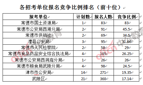 競爭熱門招考單位,前三位依次是:常德市國土資源局(競爭比例83:1)、常德市公安局西湖分局(競爭比例45.5:1)和常德市供銷社(競爭比例34.5:1)。