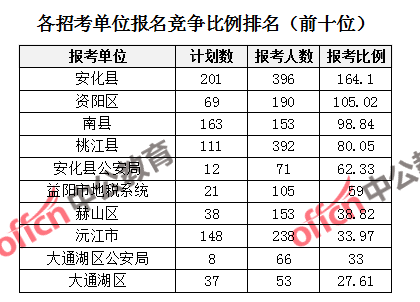 競爭熱門招考單位,前三位依次是:安化縣(競爭比例164.1:1)、資陽區(qū)(競爭比例105.02:1)、南縣(競爭比例98.84:1)。