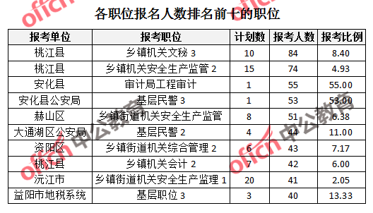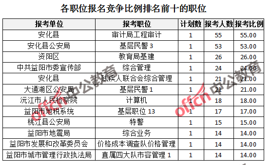 競爭熱門職位,前三位依次是:安化縣審計局工程審計(競爭比例55:1)、安化縣公安局基層民警3(競爭比例53:1)、資陽區(qū)教育局基建(競爭比例26:1)。