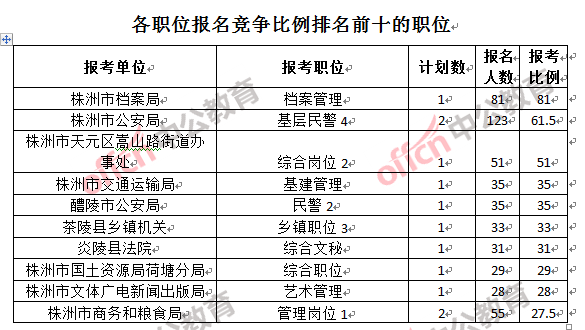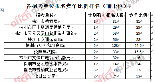 競爭熱門招考單位,前三位依次是:株洲市檔案局(競爭比例81:1)、株洲市國土資源局荷塘分局和株洲市天元區(qū)嵩山路街道辦事處(競爭比例29:1)。