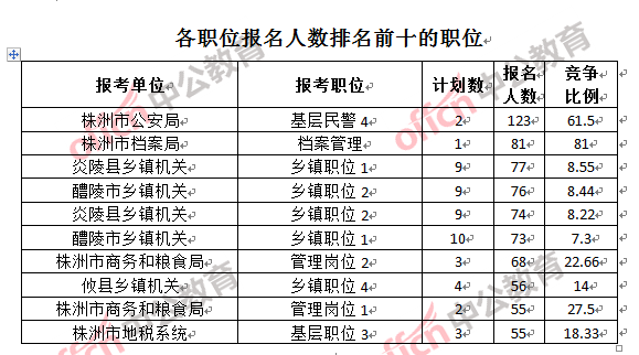 為幫助廣大考生更清晰的了解報名情況,中公教育整理了株洲市各職位的報名人數(shù)排名以及競爭比例排名,供廣大考生參考: