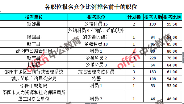 為幫助廣大考生更清晰的了解報名情況,中公教育整理了湖南邵陽各職位的報名人數(shù)排名以及競爭比例排名,供廣大考生參考: