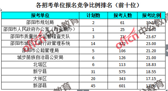 為幫助廣大考生更清晰的了解報名情況,中公教育整理了湖南邵陽各招考單位的報名人數(shù)排名以及競爭比例排名,供廣大考生參考: