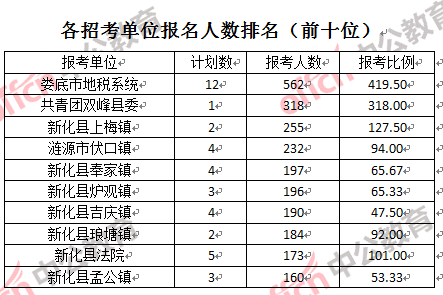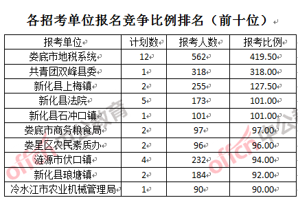 競爭熱門招考單位,前三位依次是:婁底市地稅系統(tǒng) (競爭比例419:1)、共青團(tuán)雙峰縣委(競爭比例318:1)和新化縣上梅鎮(zhèn)(競爭比例127:1)。