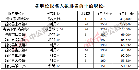 為幫助廣大考生更清晰的了解報(bào)名情況,中公教育整理了婁底市各職位的報(bào)名人數(shù)排名以及競爭比例排名,供廣大考生參考: