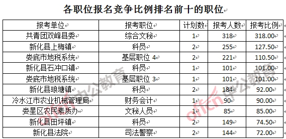 競爭熱門職位,前三位依次是:共青團(tuán)雙峰縣委綜合文秘(競爭比例318:1)、新化縣上梅鎮(zhèn)科員(競爭比例127:1)、婁底市地稅系統(tǒng)基層職位4(競爭比例110:1)