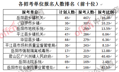 為幫助廣大考生更清晰的了解報(bào)名情況,中公網(wǎng)校整理了岳陽市各招考單位的報(bào)名人數(shù)排名以及競爭比例排名,供廣大考生參考: