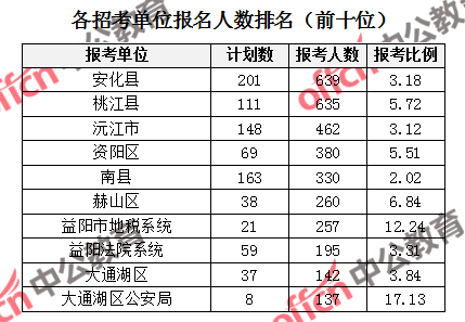 為幫助廣大考生更清晰的了解報(bào)名情況,中公網(wǎng)校整理了益陽(yáng)市各招考單位的報(bào)名人數(shù)排名以及競(jìng)爭(zhēng)比例排名,供廣大考生參考: