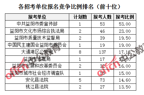 競(jìng)爭(zhēng)熱門(mén)招考單位,前三位依次是:中共益陽(yáng)市委宣傳部(競(jìng)爭(zhēng)比例53:1)、益陽(yáng)市文化市場(chǎng)綜合執(zhí)法局(競(jìng)爭(zhēng)比例23:1)、益陽(yáng)市質(zhì)量技術(shù)監(jiān)督局(競(jìng)爭(zhēng)比例19.5:1)。