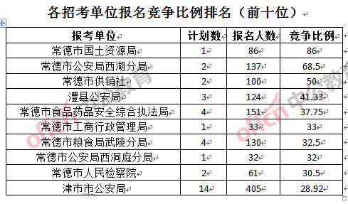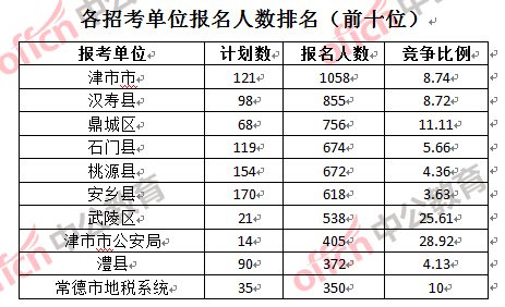 為幫助廣大考生更清晰的了解報(bào)名情況,中公網(wǎng)校整理了常德市各招考單位的報(bào)名人數(shù)排名以及競爭比例排名,供廣大考生參考: