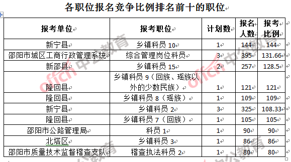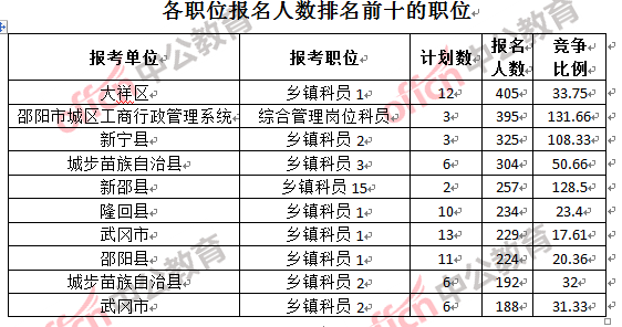 為幫助廣大考生更清晰的了解報(bào)名情況,中公網(wǎng)校整理了邵陽市各職位的報(bào)名人數(shù)排名以及競爭比例排名,供廣大考生參考: