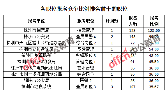 競(jìng)爭(zhēng)熱門職位,前三位依次是:株洲市檔案局檔案管理(競(jìng)爭(zhēng)比例128:1)、株洲市公安局基層民警4(競(jìng)爭(zhēng)比例99:1)和株洲市天元區(qū)嵩山路街道辦事處綜合崗位2(競(jìng)爭(zhēng)比例72:1)。