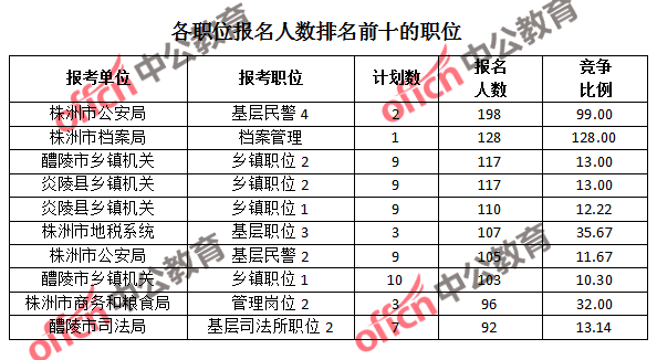 為幫助廣大考生更清晰的了解報(bào)名情況,中公網(wǎng)校整理了株洲市各職位的報(bào)名人數(shù)排名以及競(jìng)爭(zhēng)比例排名,供廣大考生參考: