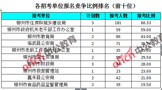為幫助廣大考生更清晰的了解報(bào)名情況,中公網(wǎng)校整理了湖南郴州各招考單位的報(bào)名人數(shù)排名以及競(jìng)爭(zhēng)比例排名,供廣大考生參考: