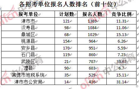 為幫助廣大考生更清晰的了解報名情況,中公網校整理了常德市各招考單位的報名人數(shù)排名以及競爭比例排名,供廣大考生參考: