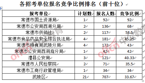 競爭熱門招考單位,前三位依次是:常德市國土資源局(競爭比例92:1)、常德市公安局西湖分局(競爭比例68:1)和常德市供銷社(競爭比例58.5:1)。
