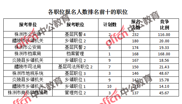 為幫助廣大考生更清晰的了解報(bào)名情況,中公網(wǎng)校整理了株洲市各職位的報(bào)名人數(shù)排名以及競爭比例排名,供廣大考生參考: