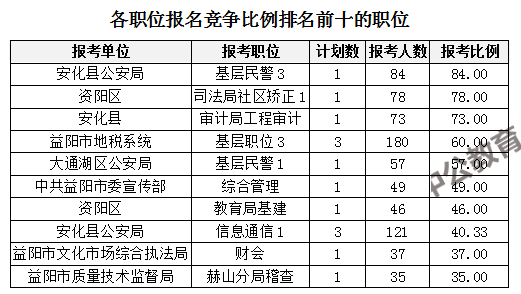 競爭熱門職位,前三位依次是:安化縣公安局基層民警3(競爭比例84:1)、資陽區(qū)司法局社區(qū)矯正1(競爭比例78:1)、安化縣審計局工程審計(競爭比例73:1)。