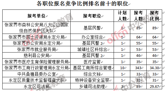 競(jìng)爭(zhēng)最熱門職位,前三依次是:張家界市森林公安局八大公山自然保護(hù)區(qū)大隊(duì)基層民警(競(jìng)爭(zhēng)比例89:1)、張家界市國(guó)土資源局永定分局辦公室綜合(競(jìng)爭(zhēng)比例64:1)和張家界市公安局永定分局基層民警2(競(jìng)爭(zhēng)比例55:1)。
