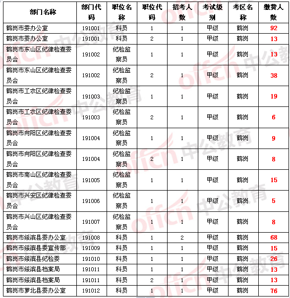 中公網(wǎng)校為參加2014年黑龍江省公務(wù)員考試的考生整理鶴崗地區(qū)截止至5月19日上午2點的部分繳費人數(shù),并且在更新中。。。由于報名網(wǎng)站報名情況每30分鐘統(tǒng)計一次,數(shù)據(jù)可能會有細微差異,所有數(shù)據(jù)僅供大家參考。