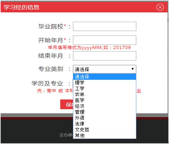 在填寫學(xué)習(xí)經(jīng)歷時要專門填寫“專業(yè)類別”,很多考生對自己的專業(yè)類別不是很清楚,考生可以根據(jù)自己的學(xué)歷情況,選擇相應(yīng)專業(yè)大類,不能確定的填寫其他。