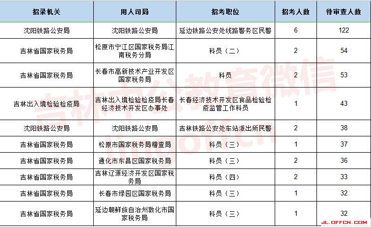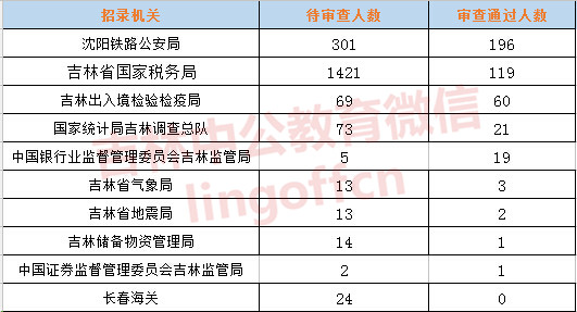 報名通過審核人數(shù)前十的職位主要集中在吉林省國家稅務局、吉林出入境檢驗檢疫局、沈陽鐵路公安局等部門,具體信息如下:
