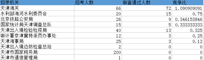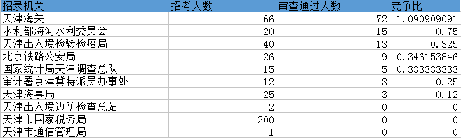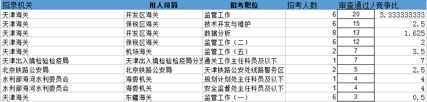 報(bào)名通過審核人數(shù)前十的職位主要集中在天津海關(guān)、水利部海河水利委員會(huì)等部門,具體信息如下: