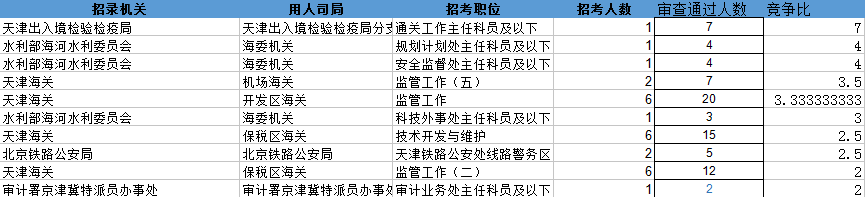 截止到30日18時(shí),競(jìng)爭(zhēng)比例的職位為天津出入境檢驗(yàn)檢疫局的工作主任科員及以下,招錄1人,截止到30日18時(shí)通過人數(shù)為7人。