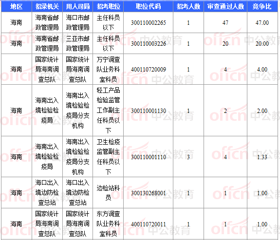 截止到30日18時(shí),競爭比例的職位為海南省郵政管理局??谑朽]政管理局主任科員以下一職,招錄1人,截止到30日18時(shí)通過人數(shù)為47人。