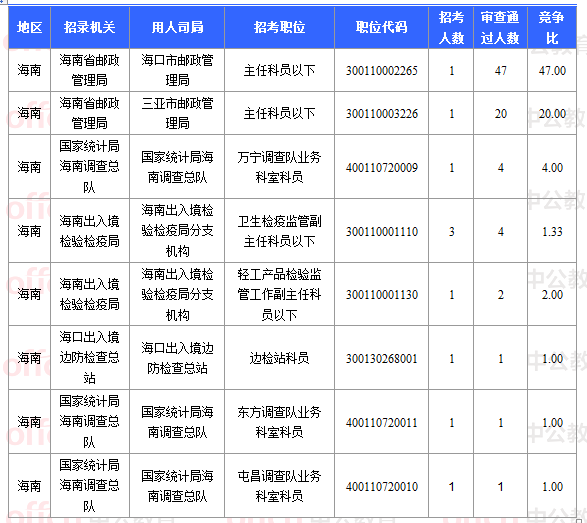 報(bào)名通過審核人數(shù)前十的職位主要集中在海南省郵政管理局、國家統(tǒng)計(jì)局海南調(diào)查總隊(duì)、海南出入境檢驗(yàn)檢疫局等部門,具體信息如下:
