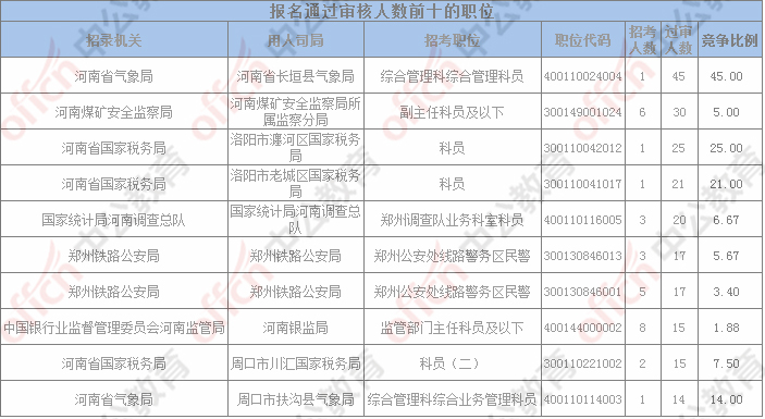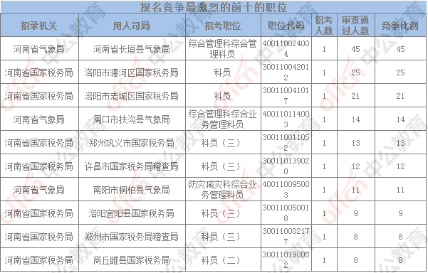 報名通過審核人數(shù)前十的職位主要集中在河南省氣象局、河南煤礦安全監(jiān)察局、河南省國家稅務(wù)局、國家統(tǒng)計(jì)局河南調(diào)查總隊(duì)等部門,具體信息如下: