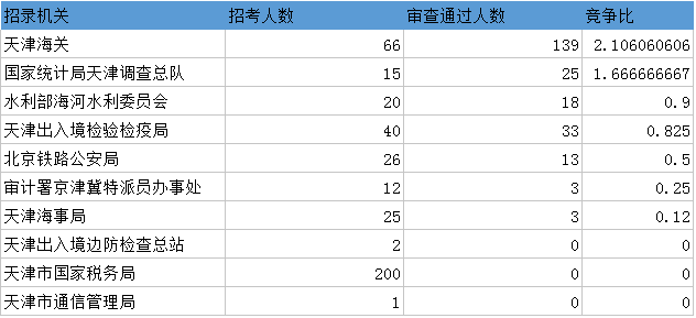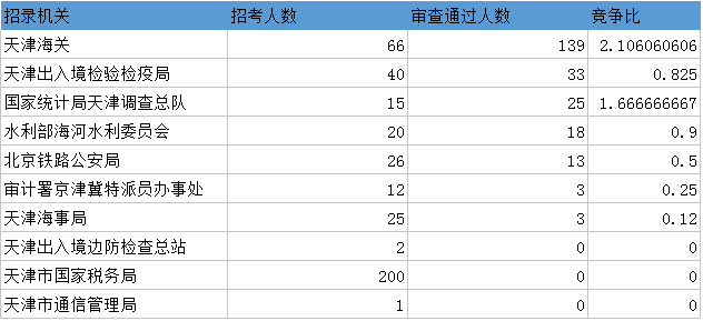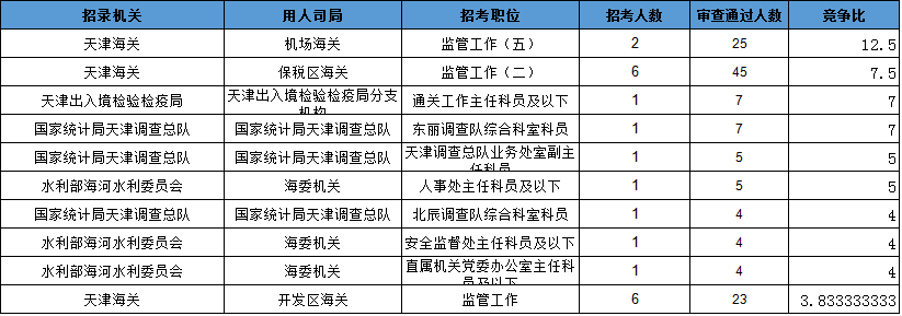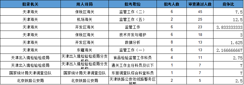 報(bào)名通過(guò)審核人數(shù)前十的職位主要集中在天津海關(guān)、天津出入境檢驗(yàn)檢疫局等部門,具體信息如下: