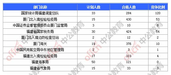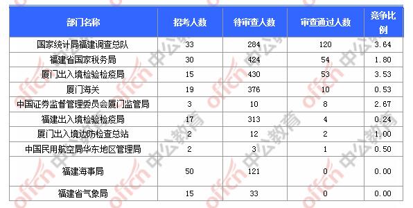 截止到31日9時,通過審核人數(shù)前三位的部門依次是:國家統(tǒng)計局福建調(diào)查總隊、福建省國家稅務局、廈門出入境檢驗檢疫局,三部門通過審核總人數(shù)達227人,占通過審核總人數(shù)的90%。