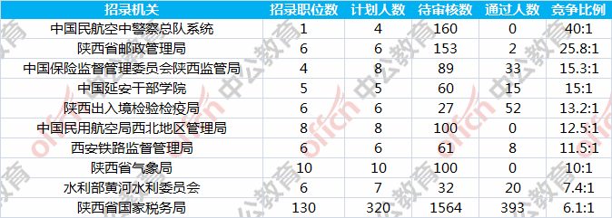 報(bào)名人數(shù)前十的職位主要集中在陜西省國家稅務(wù)局、中國民航空中警察總隊(duì)系統(tǒng)、中國保險(xiǎn)監(jiān)督管理委員會(huì)陜西監(jiān)管局等部門,具體信息如下: