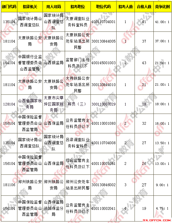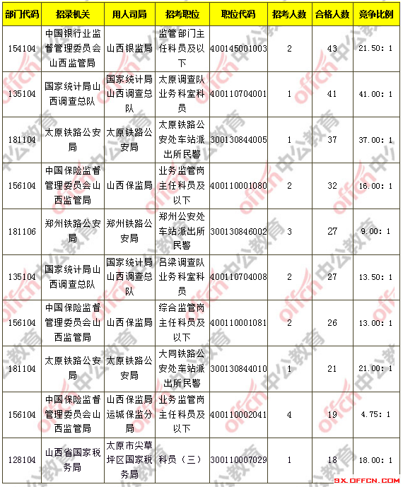 報(bào)名通過審核人數(shù)前十的職位主要集中在中國銀行業(yè)監(jiān)督管理委員會山西監(jiān)管局、國家統(tǒng)計(jì)局山西調(diào)查總隊(duì)、太原鐵路公安局等部門,具體信息如下: