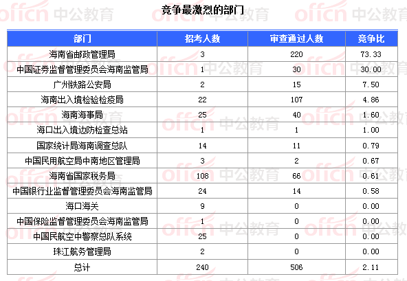 截至10月31日18時(shí),據(jù)中公網(wǎng)校統(tǒng)計(jì),國(guó)考職位中工作地點(diǎn)在海南的職位通過審核總?cè)藬?shù)為506人,共有100個(gè)職位無人通過審核,其中還有部分待審核的人數(shù)高達(dá)860人,平均競(jìng)爭(zhēng)比例為2.11:1。