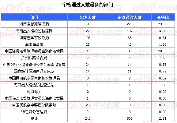 截止到31日18時(shí),通過審核人數(shù)前三位的部門依次是:海南省郵政管理局、海南出入境檢驗(yàn)檢疫局、海南省國(guó)家稅務(wù)局,三部門通過審核總?cè)藬?shù)達(dá)393人,占通過審核總?cè)藬?shù)的77.67%。