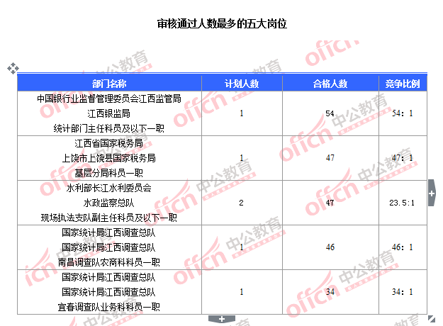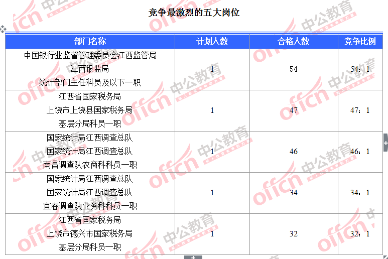 截至10月31日18時(shí),據(jù)江西中公教育統(tǒng)計(jì),國(guó)考職位中工作地點(diǎn)在江西的職位中共有2464人報(bào)名,其中1288人待審核,1176人已通過(guò),競(jìng)爭(zhēng)的崗位為江西銀監(jiān)局統(tǒng)計(jì)部門主任科員及以下一職(職位代碼400148101003),競(jìng)爭(zhēng)比為54:1。