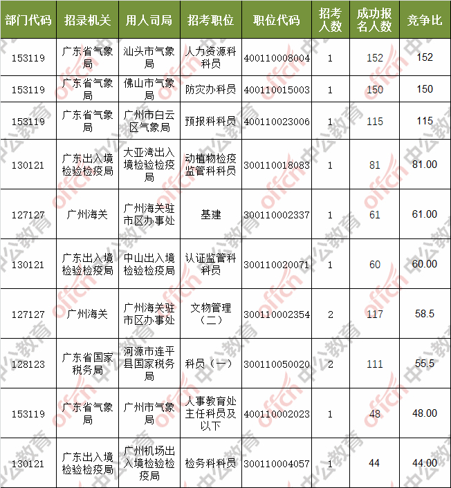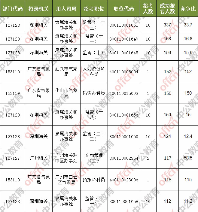 報名通過審核人數(shù)前十的職位主要集中在深圳海關(guān)、廣東省氣象局、廣州海關(guān),具體信息如下: