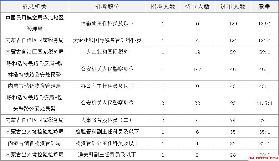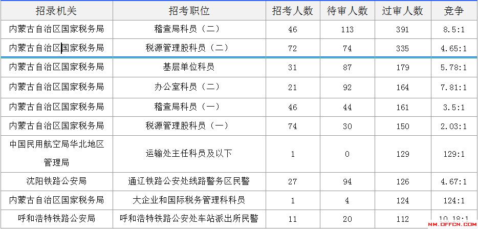 報名通過審核人數(shù)前十的職位主要集中在內(nèi)蒙古自治區(qū)國家稅務局,沈陽鐵路局、呼和浩特鐵路局以及中國民用航空局華北地區(qū)管理局等部門,具體信息如下:
