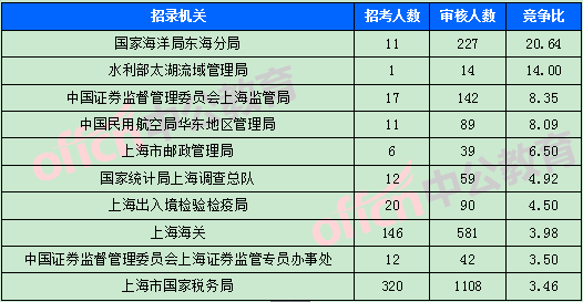 截至11月1日9時,據(jù)中公網(wǎng)校統(tǒng)計,國考職位中工作地點在上海的職位6451人報名,通過審核總?cè)藬?shù)為2502人,最熱職位259:1。