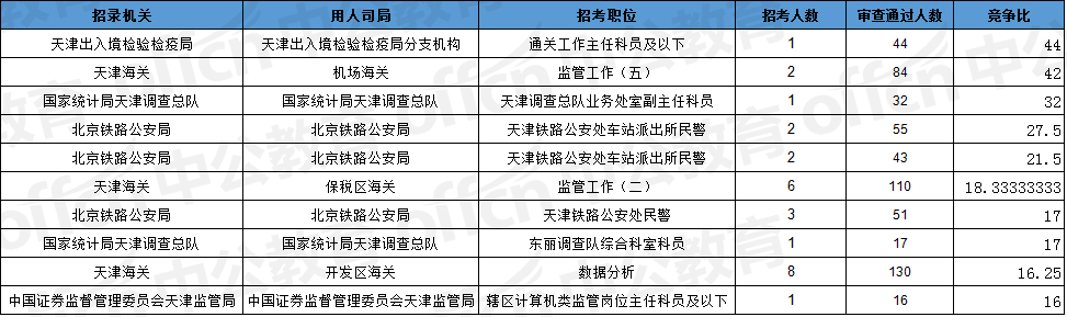 報(bào)名通過審核人數(shù)前十的職位主要集中在天津海關(guān)、北京鐵路公安局、天津出入境檢驗(yàn)檢疫局等部門,具體信息如下: