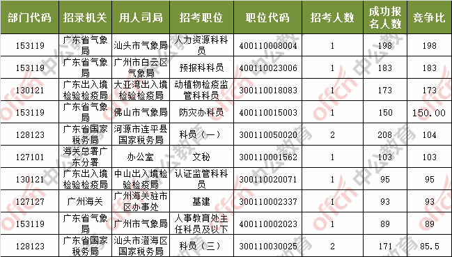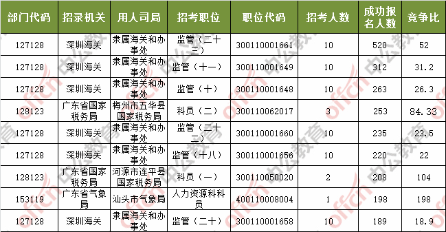 報名通過審核人數(shù)前十的職位主要集中在深圳海關(guān)、廣東省國家稅務局、廣東省氣象局等部門,具體信息如下: