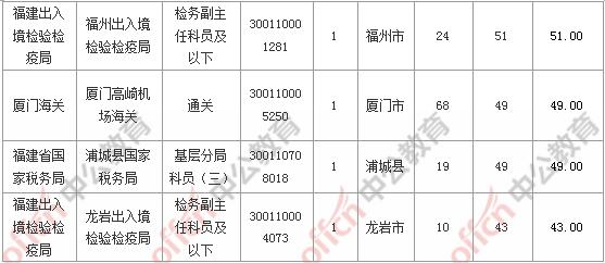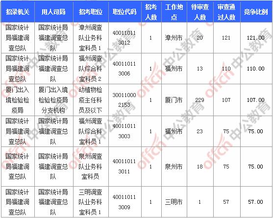報名通過審核人數(shù)前十的職位主要集中在國家統(tǒng)計局福建調(diào)查總隊、廈門出入境檢驗檢疫局、福建出入境檢驗檢疫局等部門,具體信息如下: