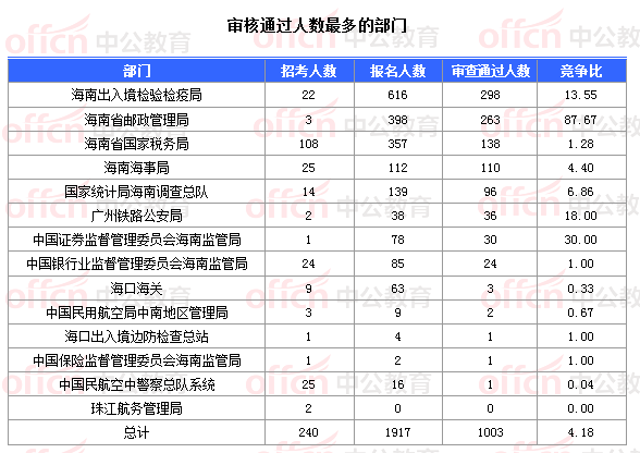 截止到1日16時,通過審核人數(shù)前三位的部門依次是:海南出入境檢驗檢疫局、海南省郵政管理局、海南省國家稅務局,三部門通過審核總人數(shù)達699人,占通過審核總人數(shù)的69.69%。