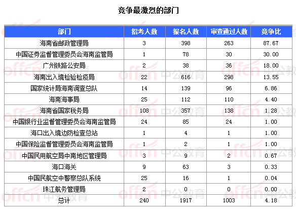 為幫助廣大考生更清晰的了解今日報名情況,中公教育整理了審核通過人數(shù)的部門以及競爭比例最激烈的部門,供廣大考生參考: