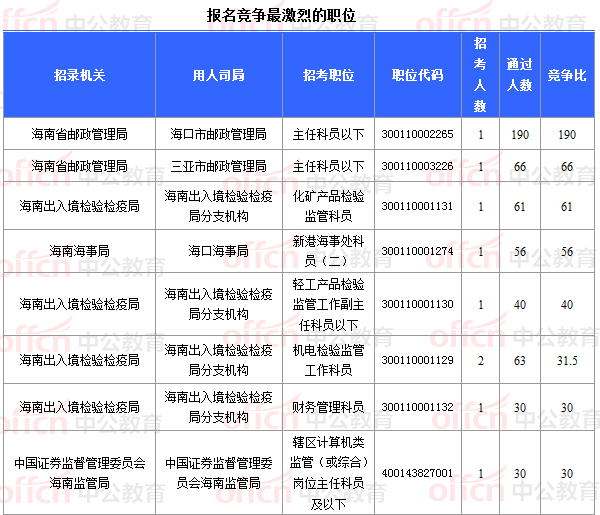 報(bào)名通過(guò)審核人數(shù)前十的職位主要集中在海南省郵政管理局、海南出入境檢驗(yàn)檢疫局、海南海事局等部門,具體信息如下: