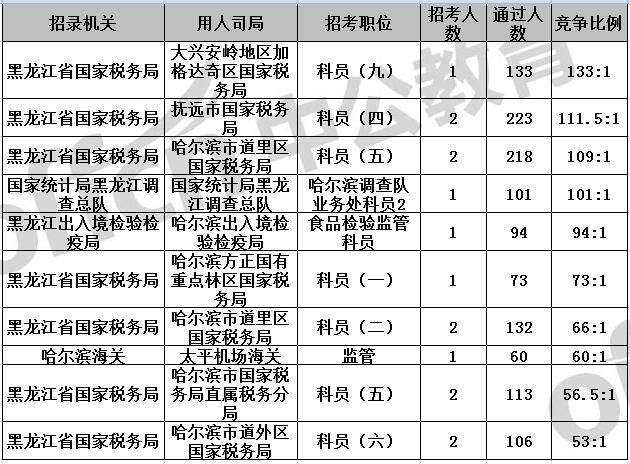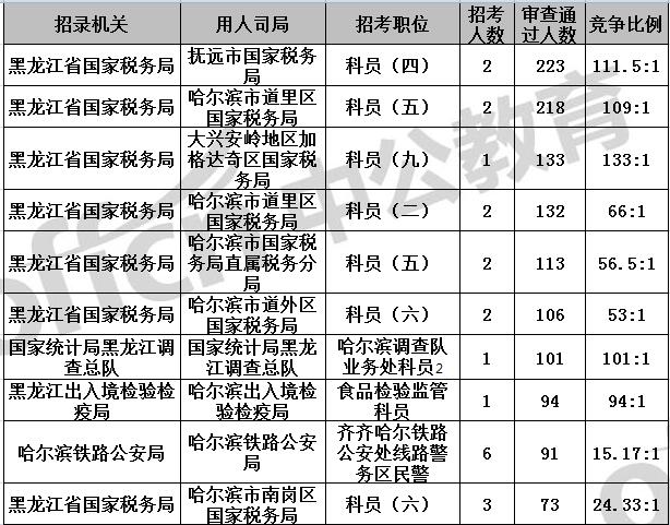 報(bào)名通過(guò)審核人數(shù)前十的職位主要集中在黑龍江省國(guó)家稅務(wù)局、國(guó)家統(tǒng)計(jì)局黑龍江調(diào)查總隊(duì)、黑龍江出入境檢驗(yàn)檢疫局等部門,具體信息如下: